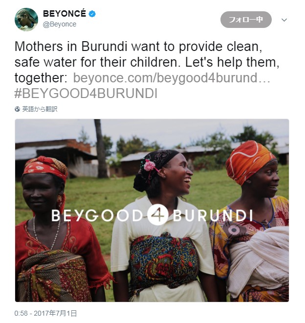 「ブルンジに住む母親たちは、きれいで安全な水を子供たちに飲ませてあげたいと思っています。彼女たちを助けましょう」―ビヨンセのツイート