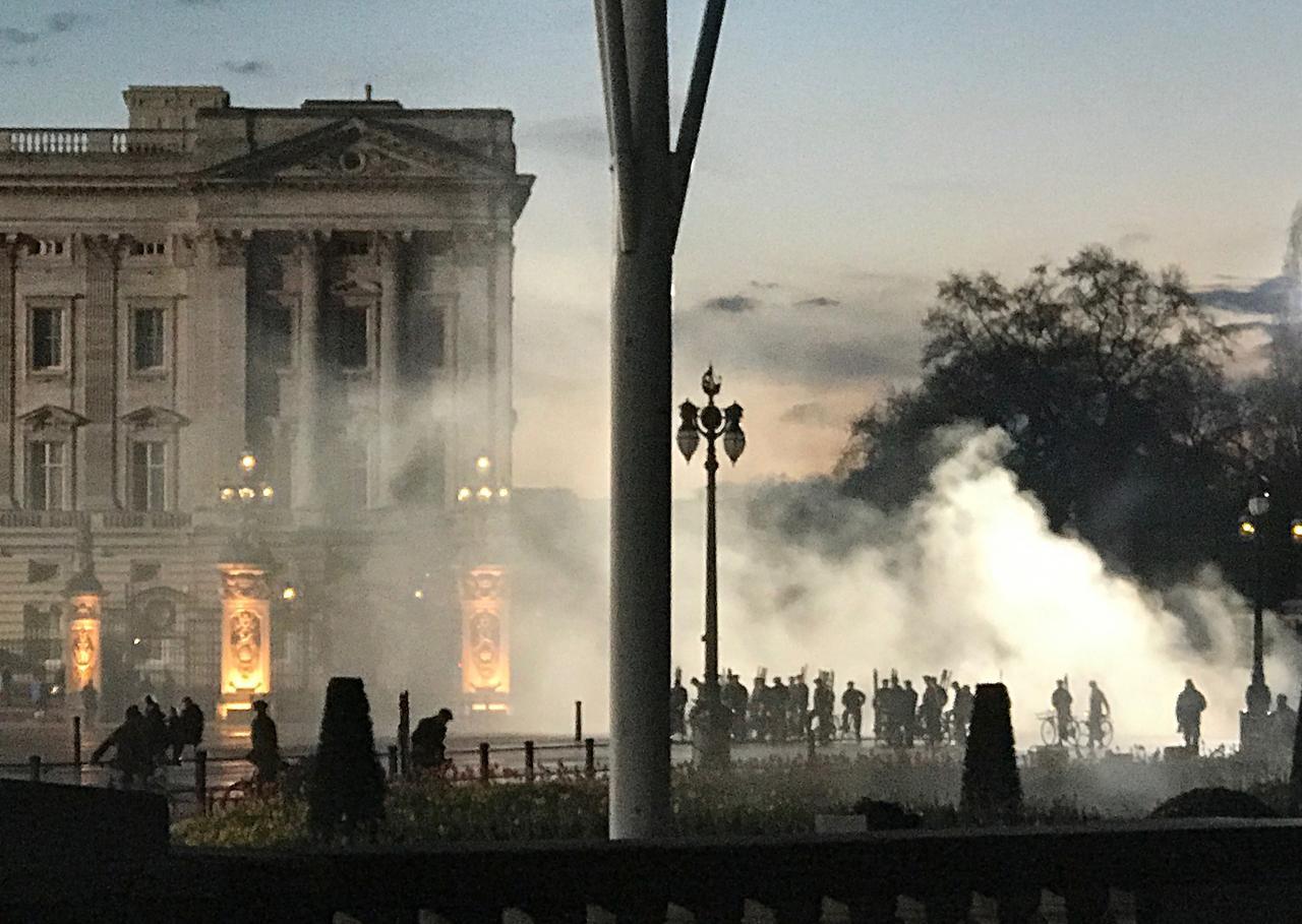 歴史あるバッキンガム宮殿と、メリー・ポピンズのアイコニックな衣装が織りなすコントラストで、現場は一瞬にしてファンタジーな雰囲気に。