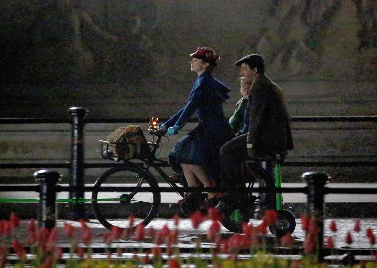 そんな世界観の撮影現場の一方で、自転車に乗ったメリー・ポピンズと、大人になったマイケルとその子供たちの撮影シーンでは、キャストたちの下に自転車を操縦する撮影クルーの姿が映し出されたという、なんともシュールな1枚も。