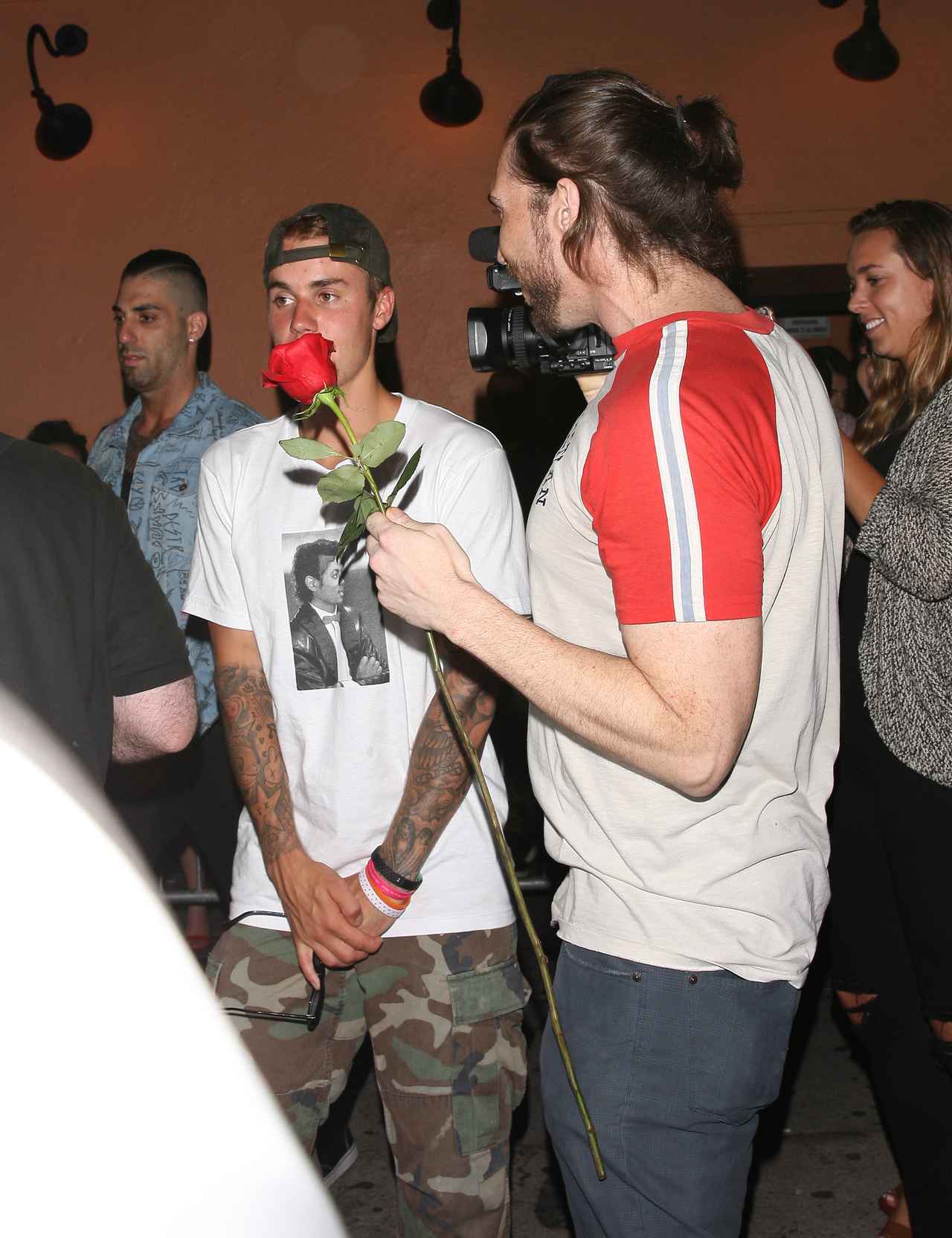 ジャスティンに向かって、1輪のバラを差し出すこの男性。もしや彼の熱狂的なファン? と思いきや、よく見ると男性の右肩にTVカメラらしきものがのっかっている。