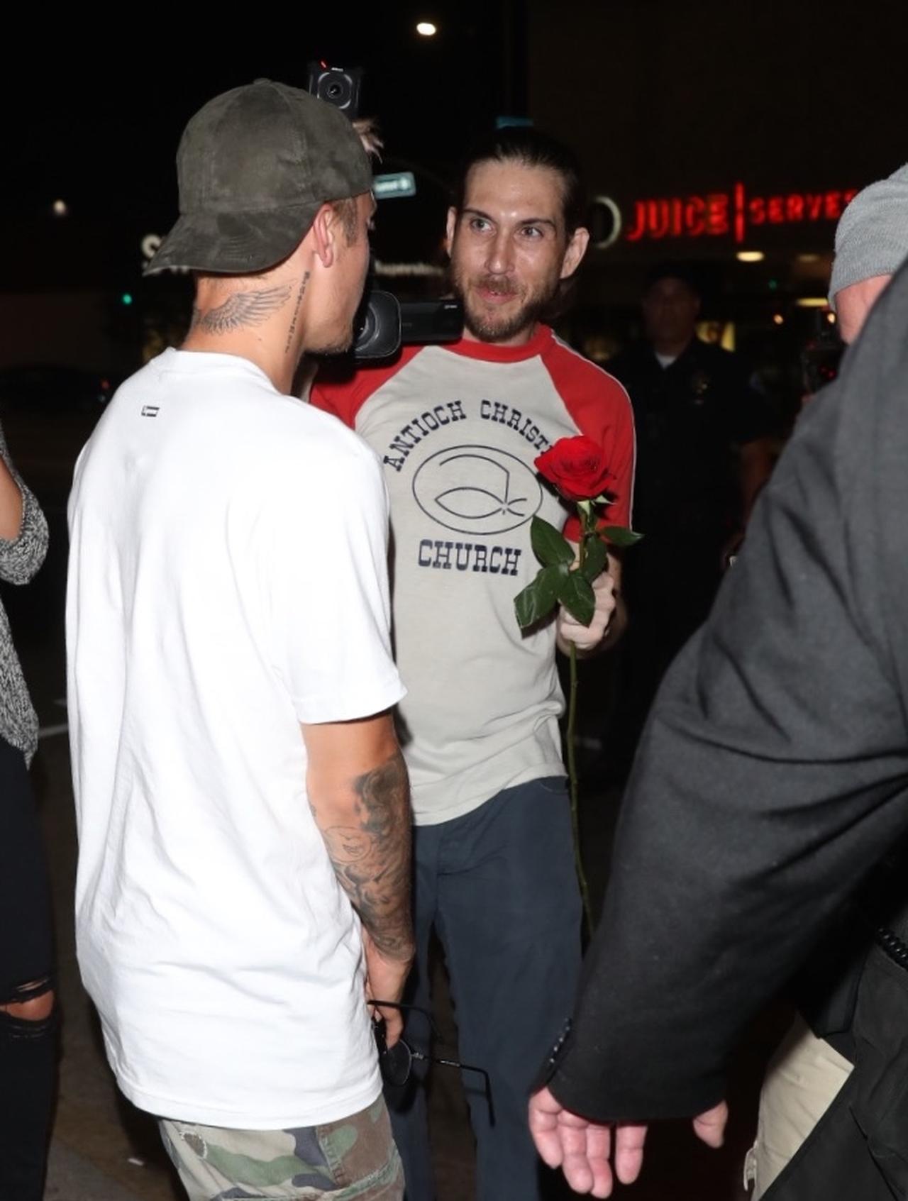 ワールドツアー中の人気シンガー、ジャスティン・ビーバーがロサンゼルスのクラブから出てくるところをキャッチ。出てくるや否や大勢のファンやパパラッチに囲まれてしまったジャスティンだが、そこに1人の気になる男性の姿を発見。