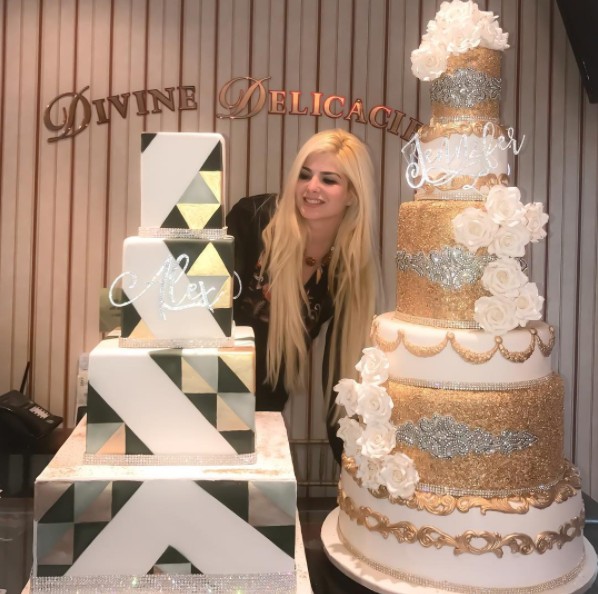 ジェニファーのケーキは、白とゴールドが6段にもなり所々バラが装飾された豪華なケーキ。アレックスのケーキは、黒やゴールドで描かれた幾何学柄のケーキ。