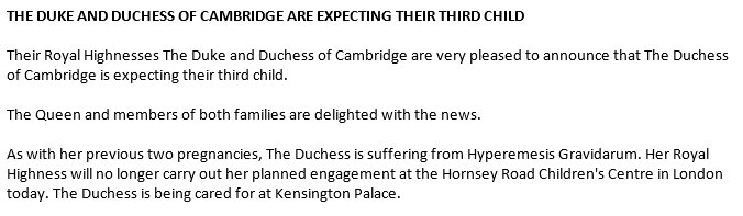 先ほど公開された公式声明文では、エリザベス女王をはじめ、双方の家族全員が祝福していることが記されていたほか、キャサリン妃が過去の妊娠時と同様、重いつわりに見舞われていることから、この日予定されていた公務への出席を見送ることが発表された。