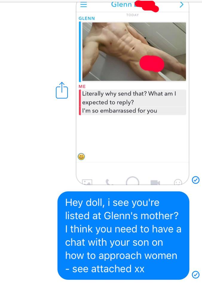 SNSでグレンの母親を見つけ出したレベッカは、彼が裸の写真を送ってきた時のやりとりをスクリーンショットで撮影したものを母親に送信。