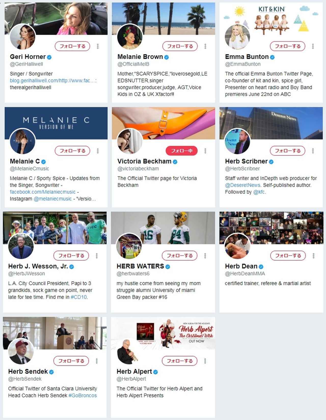 フォローされている人の名前の共通点にお気づきだろうか?フォローされている11人のうち、6人の名字が「ハーブ」で、残りはかつて一世を風靡した歌手グループ「スパイス・ガールズ」の元メンバー5人。