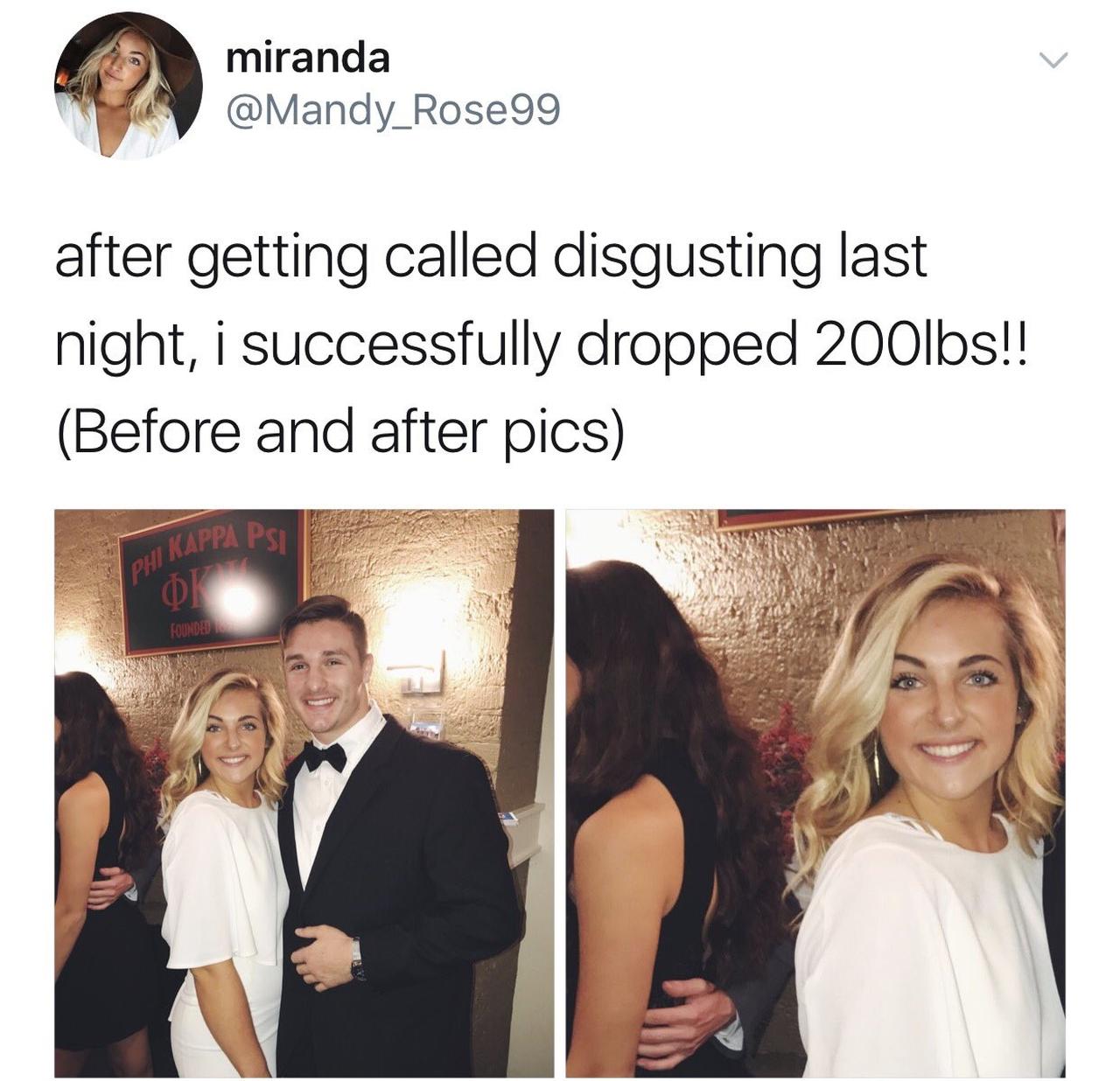 ミランダと名乗るこの女性は、自身のツイッターに「昨夜、『醜い』って言われたから、200ポンド(約90キロ)の減量に成功した‼ ビフォー&アフターの写真はコチラ」と2枚の写真を公開。
