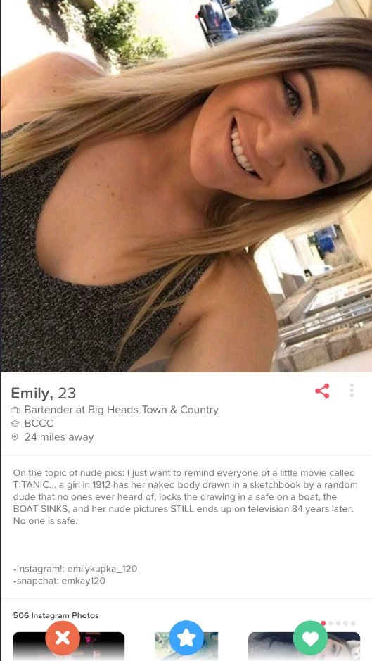 エミリーという名前の23歳の女性が、世界中で多くの利用者がいる出会い系サイト「Tinder」で公開されているプロフィールに書いた、「裸の写真を撮らない理由」が100%納得できると話題に。