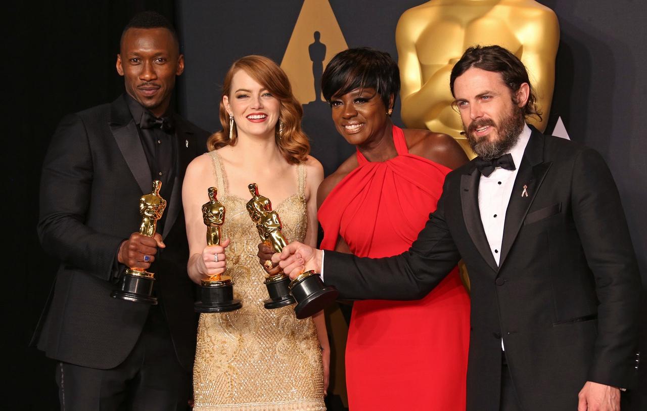 写真は第89回アカデミー賞の受賞者たち。左から映画『ムーンライト』のマハーシャラ・アリ、『ラ・ラ・ランド』のエマ・ストーン、『フェンス』のヴィオラ・デイヴィス、『マンチェスター・バイ・ザ・シー』のケイシー・アフレック。