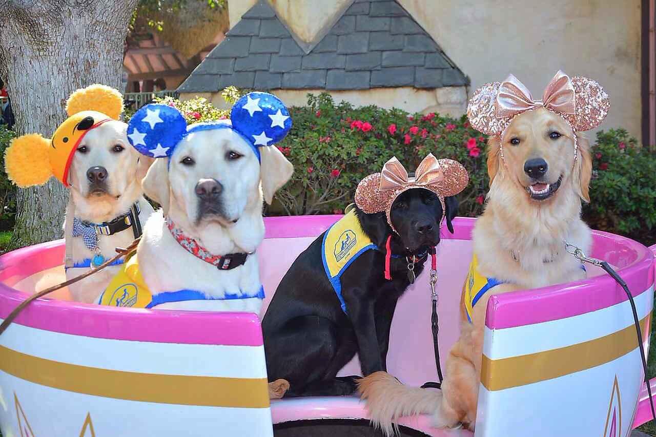 オーナーに連れられて同パークで有意義な時間を過ごしたサービスドッグたちは、ミッキーマウスの耳をモチーフにした帽子やカチューシャを頭につけてこの表情。心なしか笑っているように見える。