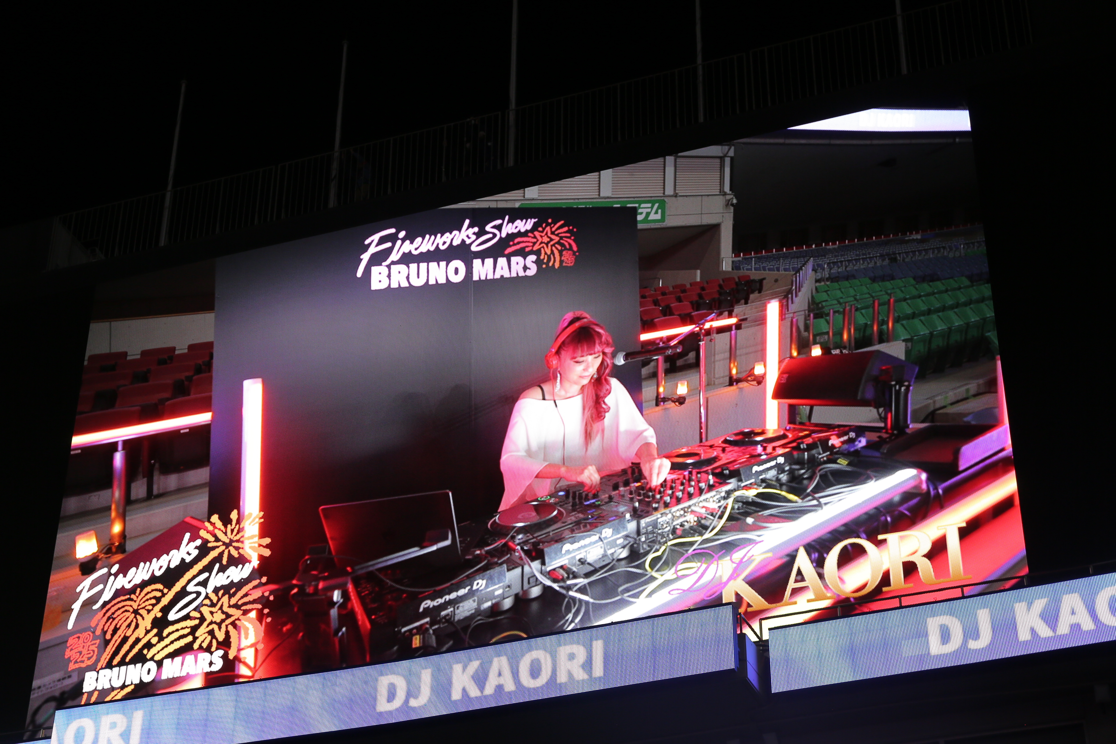 開場後のスタジアムでは、YonYon、DJ KOMORI、DJ TARO、DJ KAORIという日本を代表する人気DJ陣がリレー形式で登場し、メインイベントの花火打ち上げまで開場中も場内を盛り上げた。