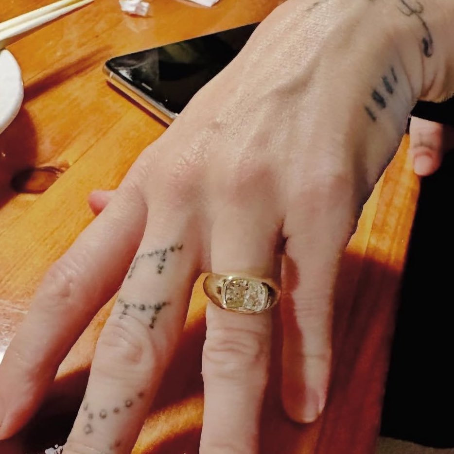 マックスがマイリーの渡したゴールドの婚約指輪は、ロサンゼルスの人気ブランドであるジャッキー・アイシュのもので、ジャッキーがマイリーのために14金のイエローゴールドにクッションカットの石をセットした指輪を特注でデザインしたことを代理人がPeopleで認めている。