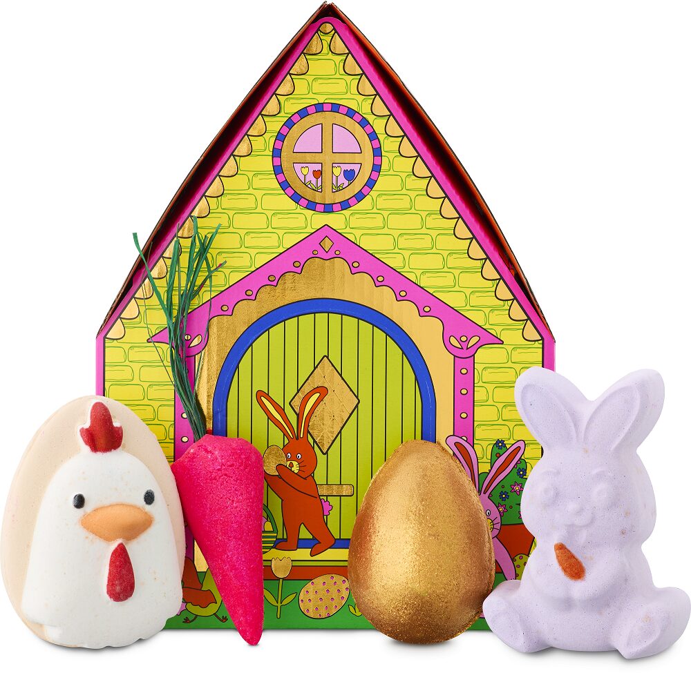 カラフルなうさぎの隠れ家には、イースターエッグのおいしいお菓子くらいバスタイムを楽しくする4種類の入浴料が入っています。