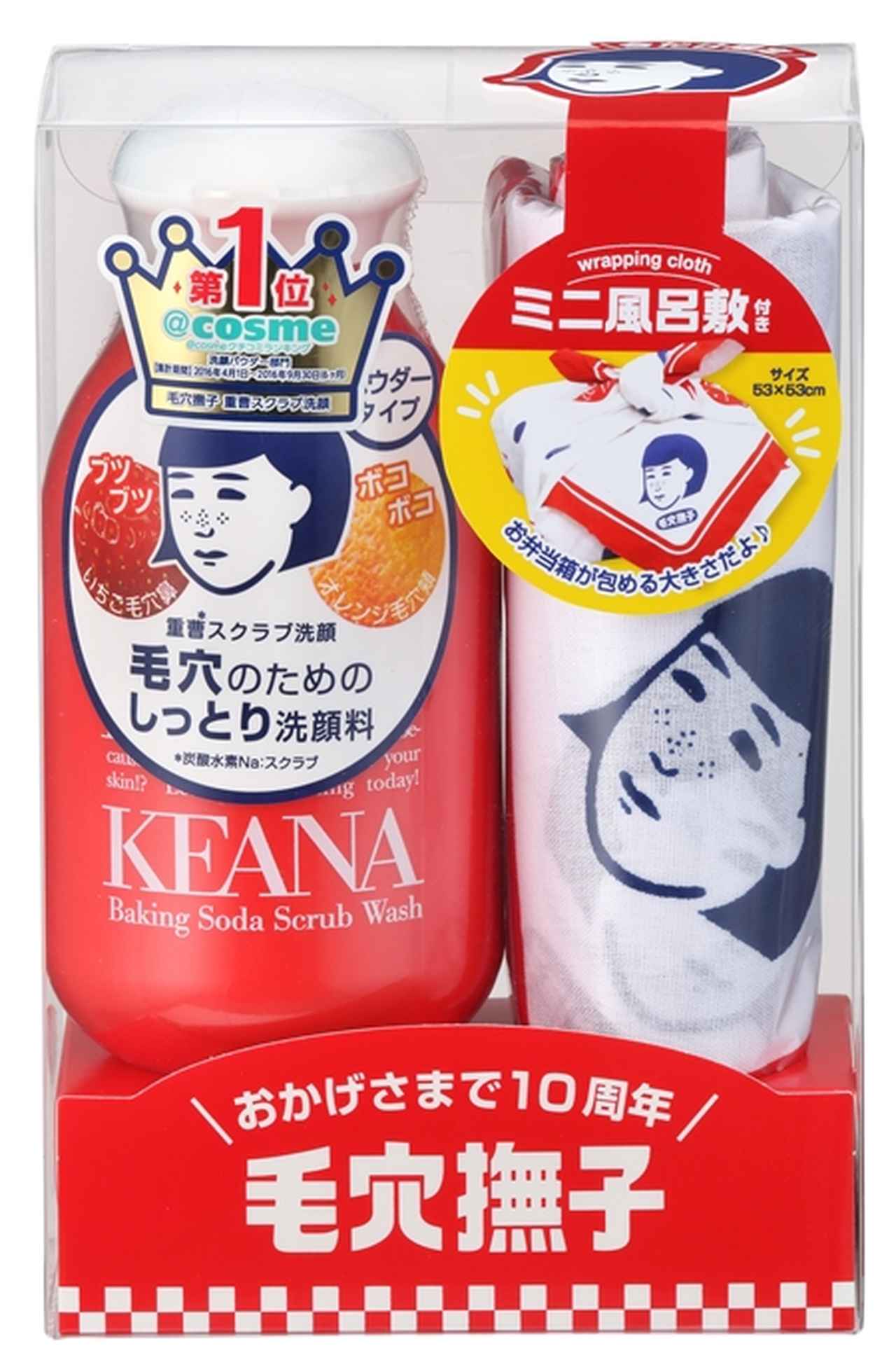 そんな「毛穴撫子」シリーズ誕生10周年記念のセットには、大人気のパウダー洗顔料「毛穴撫子 重曹スクラブ洗顔」に小物やギフトを包んで使える「オリジナルミニ風呂敷」が一緒になって発売される。