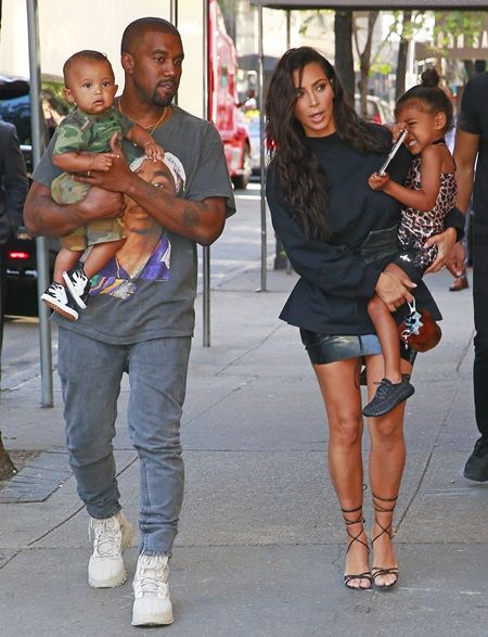 息子セイントくんを抱くカニエと、娘ノースちゃんを抱くキム・カーダシアン。