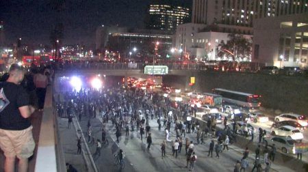 LAのダウンタウンのフリーフェイを占拠する人々。