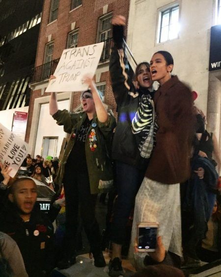トランスジェンダーのモデルで女優としても活躍するハリはLGBTコミュニティの仲間と「Trans Against Trump(トランスジェンダーはトランプに反対)のカードを掲げて抗議。写真中央で拳を上げているのがハリ。