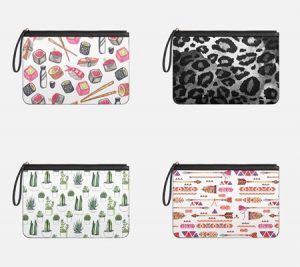 お寿司柄のクラッチバッグには、お箸やおちょこもデザインされている。