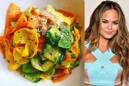 夫でシンガーのジョン・レジェンドとの第1子となる女の子を今年4月に出産したばかりなのに、すぐにスリムな姿でレッドカーペッドに登場して世間を驚かせているクリッシー。モデル界きっての料理上手として知られる彼女は、ズッキーニやニンジン、アスパラなどの野菜をリボン状にスライスしたカラフルなぺペロンチーノ風べジ・パスタで賢くカロリーセーブ。