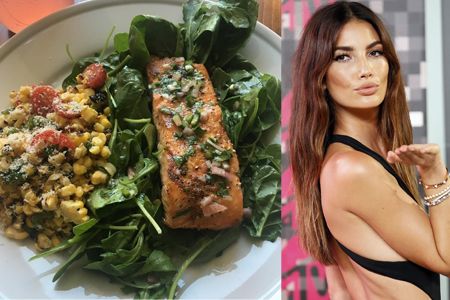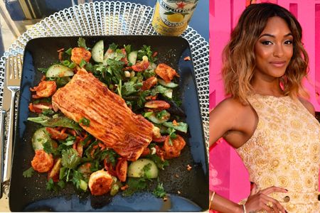 6歳の男の子のママで、ラッパーのジェイ・Zが運営するYouTubeチャンネルで料理番組の司会をしていたこともあるジョーダン。スレンダーなボディからは想像もつかないほど食べることが大好きな彼女が、この日ランチに作ったのは、インド風のスパイスで味つけしたサーモンと海老を細かく切った葉野菜やパクチー、トマト、キュウリなどとミックスしたボリュームたっぷりのサラダ。美肌効果もあるサーモンはモデルに大人気!