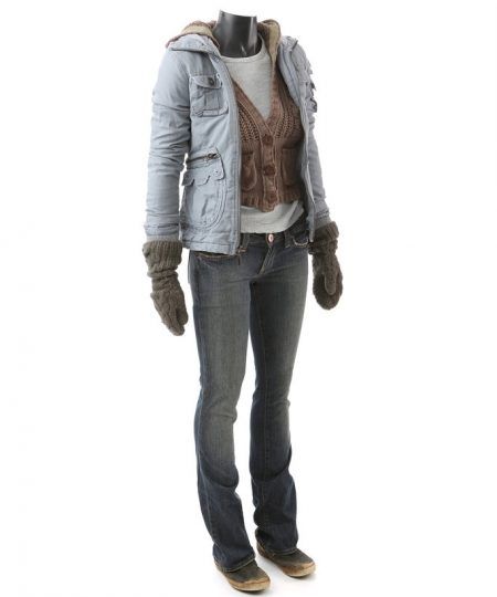 女優のクリステン・スチュワート演じる主人公のベラが、エドワードの不思議な能力に気づき、彼の正体を問い詰めた際に着用していたワークジャケット、ニットカーディガン、タンクトップ、ジーンズ、手袋、スニーカーの衣装セット。