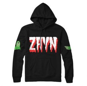 ポップなビッグサイズの「ZAYN」のロゴと、ゼインがデザインした緑色のモンスターが腕に入ったスウェットパーカー。白もアリ。