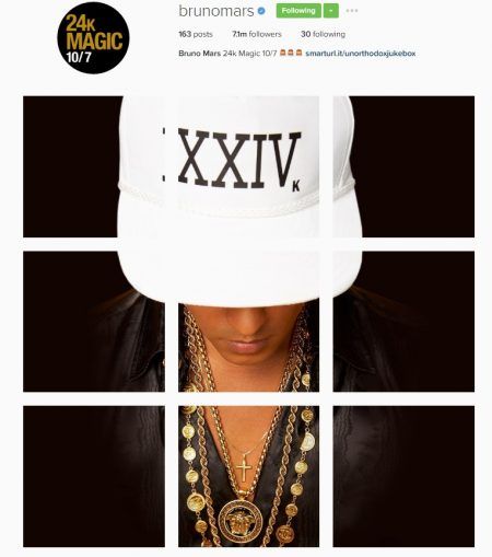 インスタグラムでは9枚の画像が合わさるとゴールドのネックレスをじゃら着けし、「XXIV(24)」とロゴの入ったキャップを被ったブルーノの新曲アートワークが完成する仕組みに。