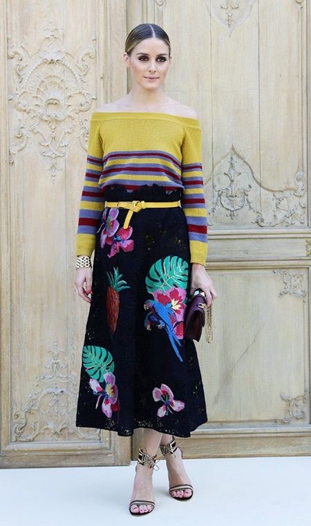 NY、ロンドン、ミラノ、パリと9月からスタートしたファッションウィークでの主要4都市を制覇したファッショニスタのオリヴィア。この日は、秋らしい配色のボーダーオフショルニットに大きめのトロピカル柄が新鮮な同ブランド上下で。いずれもリゾートコレクションのもの。ヒールはGianvito Rossi。