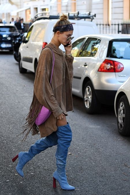 パリ・ファッションウィーク中Saint Laurentにショッピングに出かけたヘイリーは、フリンジ付きスエードチュニックに、ブルーのサイハイブーツ&ピンクのバッグをプラスし、スタイリッシュに。