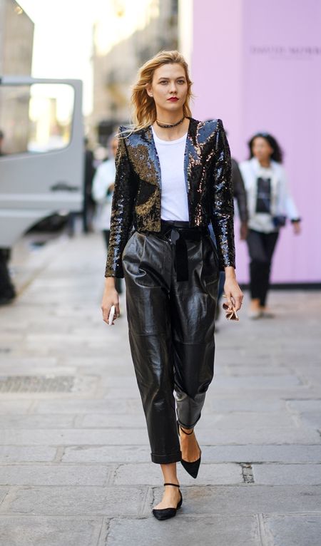 パリ・ファッションウィーク中のためパリに滞在しているカーリーは、スパンコールジャケット、白T、レザーのワイドパンツでモノトーンながらパンチの効いたスタイル。