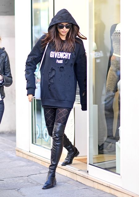 パリ・ファッションウィークが行われているパリで買い物に出かけたイリーナは、ダメージパーカをワンピ風に着て、レザーのサイハイブーツをプラスしてエッジーに。