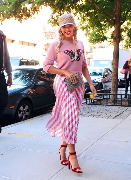NYで母のマンションに訪れたビヨンセは、蝶が描かれたニットや、ストライプスカートなどピンクを中心としたコーディネートで大人可愛く。