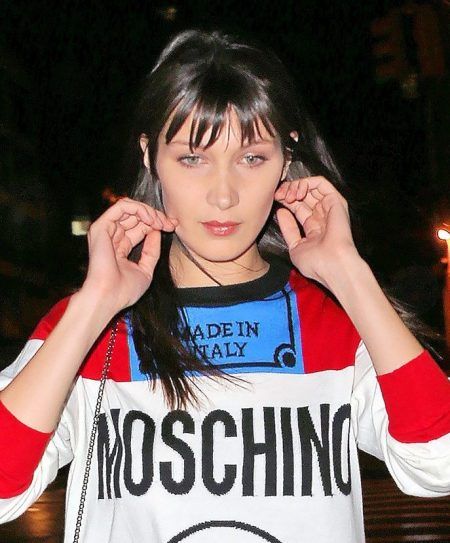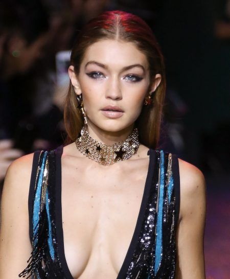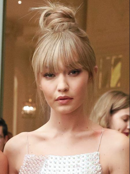 パリでのファッションウィーク中のイベントに前髪アリのお団子ヘアで登場したモデルのジジ。目にかかるくらいの長めシースルーバングは本物 or 偽物?