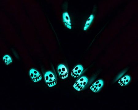 ブラックライトに反応するネイルでガイコツを描くと、まるで暗闇の中で笑っているよう。