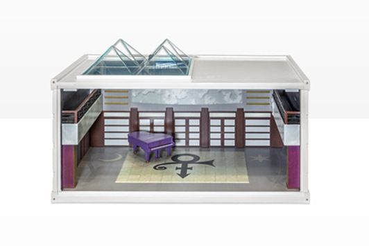 遺骨は前柱部分に収められており、正面部分を開くと、ペイズリー・パークのアトリウムのレプリカが登場。中にはプリンスお気に入りだった紫色のヤマハ製ピアノのレプリカもあり、照明もしっかりついている。