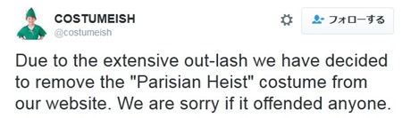 ネット上での批判が集中するなか、昨日、Costumeishがツイッターで販売中止を発表。「大規模な批判を受けたため『パリの強奪』コスチュームをサイトから取り下げました。気分を害した方がいらっしゃったら謝罪します」とコメントした。
