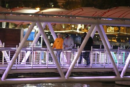 スタッフと一緒にテムズ川を船で移動してレストランへ。