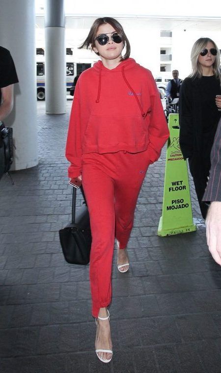 スウェットを普段着に取り入れるスタイリングを流行させた第一人者的ブランドで、セレブにも大人気のVetementsの鮮やかな赤のセットアップをチョイスしたセレーナ。Diorのサングラスや、Louis Vuittonのバッグ、Jimmy Chooのサンダルでさらにラグジュアリーに。