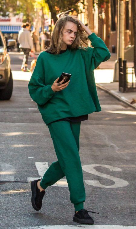 オーストラリア発のユニセックス・ブランドSkodiaのグリーンのスウェットの上下で、この日滞在していたNYにあるシンガーのテイラー・スウィフトの自宅からコンビニへ向かったカーラ。同ブランドの洋服はモードでミニマルなフォルムが魅力。