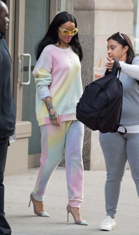 上下総額で堂々のトップに輝いたのは、LAのラグジュアリー・ライフスタイル・ブランドThe Elder Statesmanの淡いレインボーカラーのスウェット上下を愛用するリアーナ。Moschinoのスワロフスキー付きサングラスやManolo Blahnikのミントグリーンのキャップトゥパンプスでガーリーに。