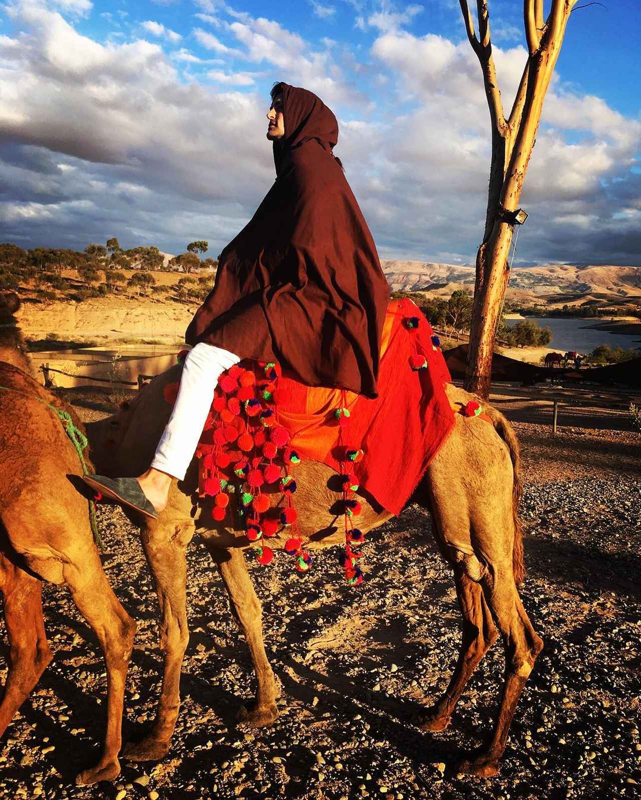 パーティー仕様にドレスアップしたラクダに乗って砂漠をお散歩。青い空に民族衣装風の出で立ちが映える!