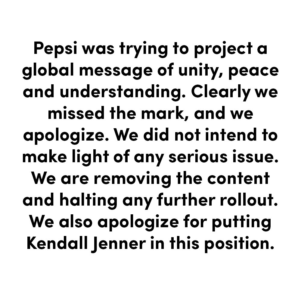 「ペプシはこの広告を通して、平和、理解、そして団結というグローバルなメッセージを広めることを目的としていました。しかしやり方が間違っていたことは明らかで、それについて謝罪します。私たちは深刻な問題を軽んじて利用したつもりはありません。この騒動を受けて、広告を取り下げ、今後一切使用しないことを決定しました。また、騒動にケンダルを巻き込んでしまったことを陳謝します」と声明したペプシ社。