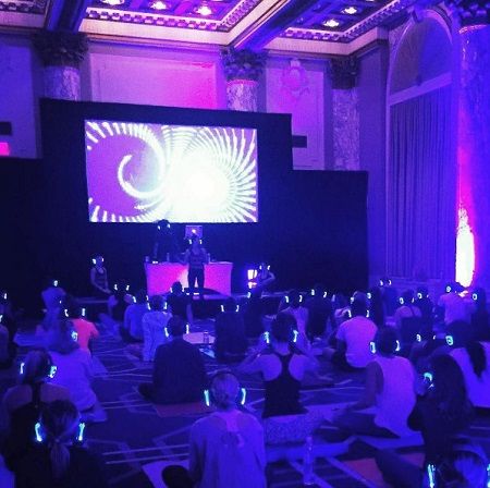 ヘッドフォンから流れてくるのは、心地のいいディープハウス・ミュージックが主流。しかもDJがライヴで流すため、ヘッドフォンで外とは遮断されていても、クラブ音楽とヨガの融合で、会場には新鮮な一体感が生まれるとか。