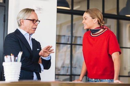 デザイナーのトミー・フィルフィガーと熱心に打ち合わせをするジジ(前回のコレクション制作風景より)。
