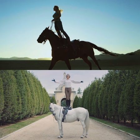 (上)「マイ・ウェイ」、(下)「ブランク・スペース」MVのテイラー。馬の上で立ち上がっているのが同じ。
