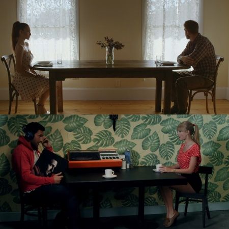 (上)「マイ・ウェイ」、(下)「ウィー・アー・ネヴァー・エヴァー・ゲッティング・バック・トゥギャザー」のテイラー。どちらのMVにも、長テーブルで向かい合うシーンが。