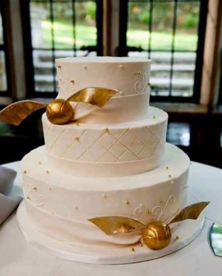 金のスニッチが乗ったウェディングケーキがキュート。