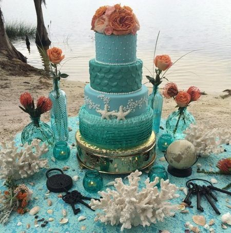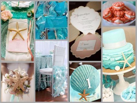 夏のウェディングのテーマで人気なのが、海が舞台の映画『リトル・マーメイド』。爽やかなブルーを基調に貝殻やヒトデ、魚などをモチーフにしたマリン・テイストのデコレーションやケーキがキュート。