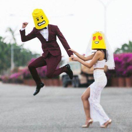 お手製のレゴマスクでおしゃれでポップなウェディング・フォトに。