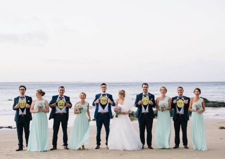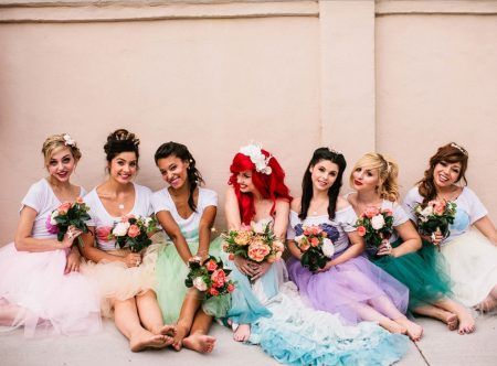 主人公アリエルの赤い髪を再現した花嫁の周りには貝殻プリントのTシャツにチュールスカートでマーメイド風の着こなしのブライズメイドたちが。