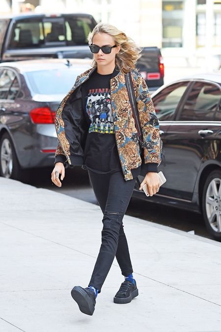 バンドTにSaint Laurentのアニマルデザインのブルゾンをセットしたスタイルは、黒のスキニーとクリーパーでトーンダウンさせて。